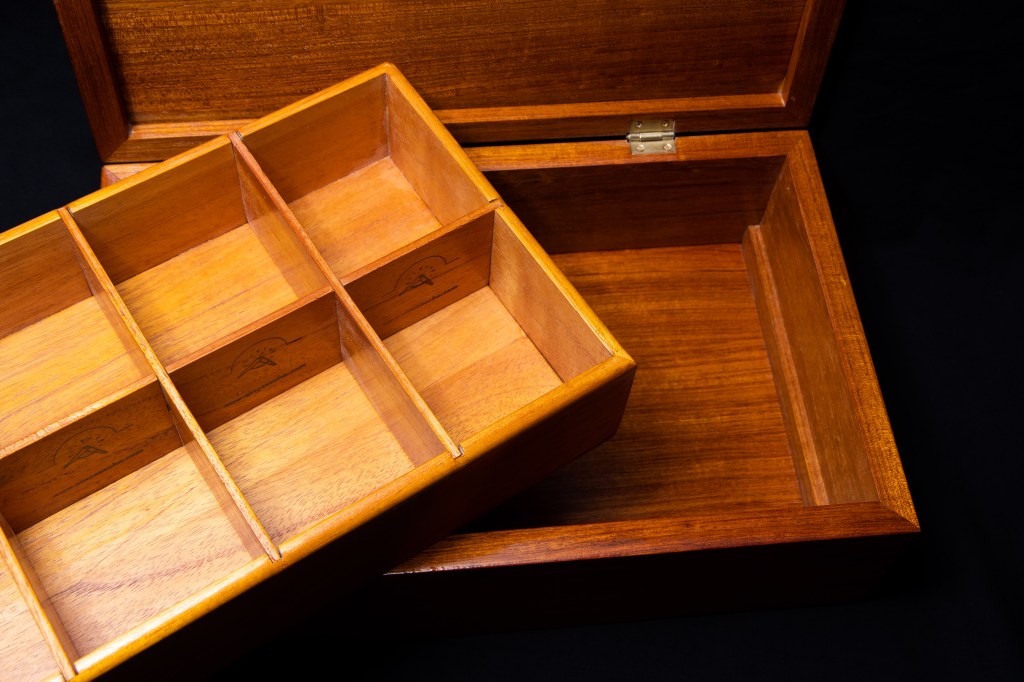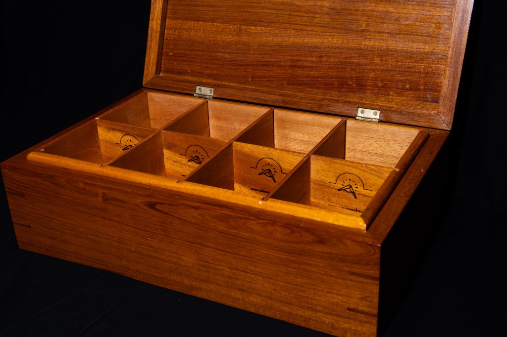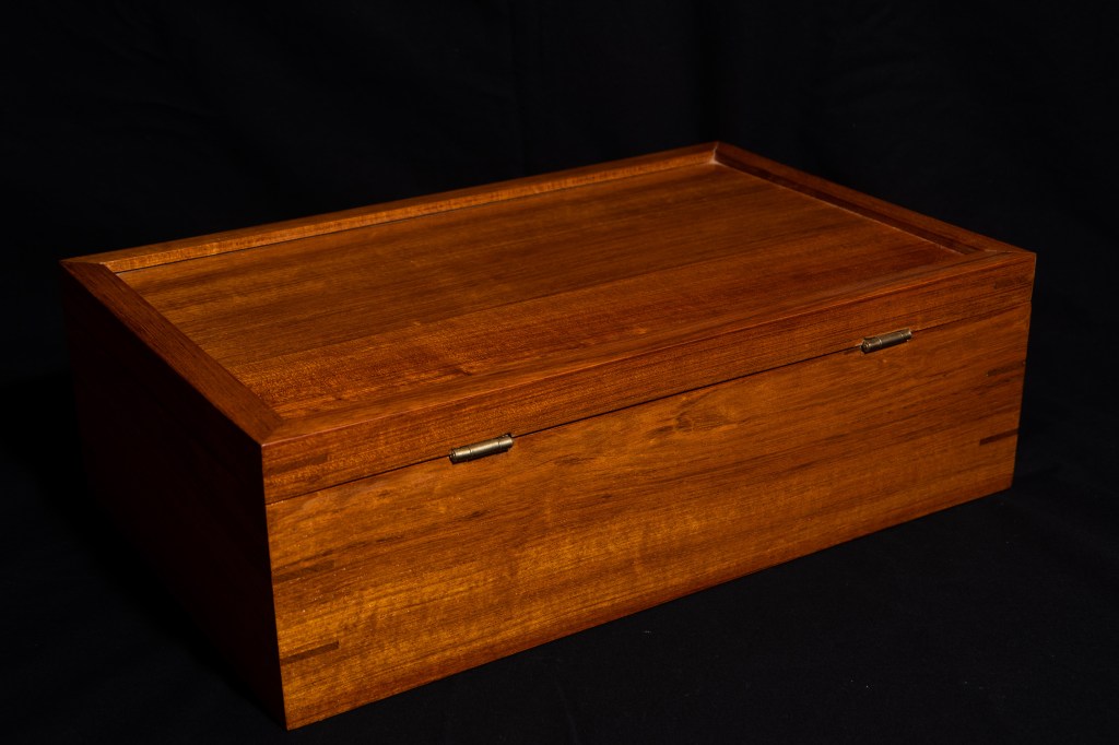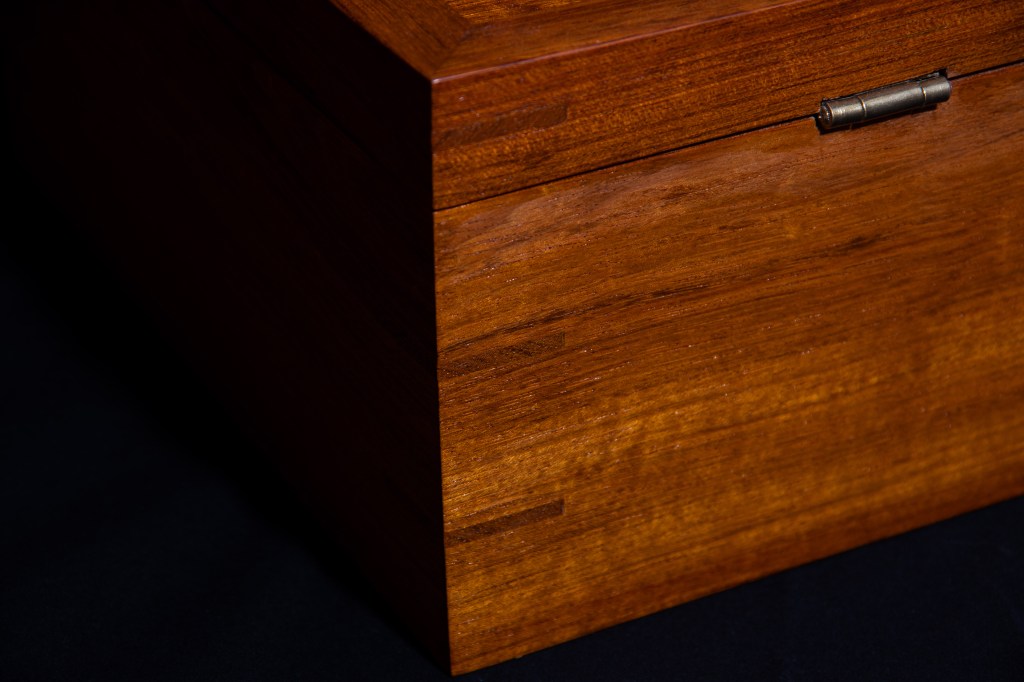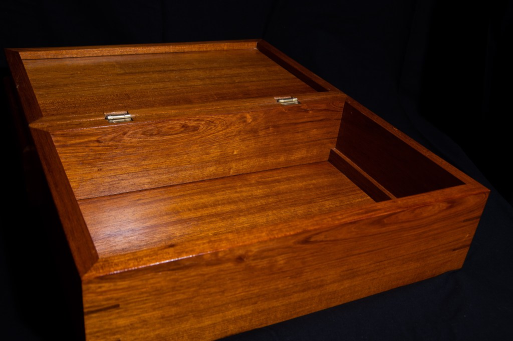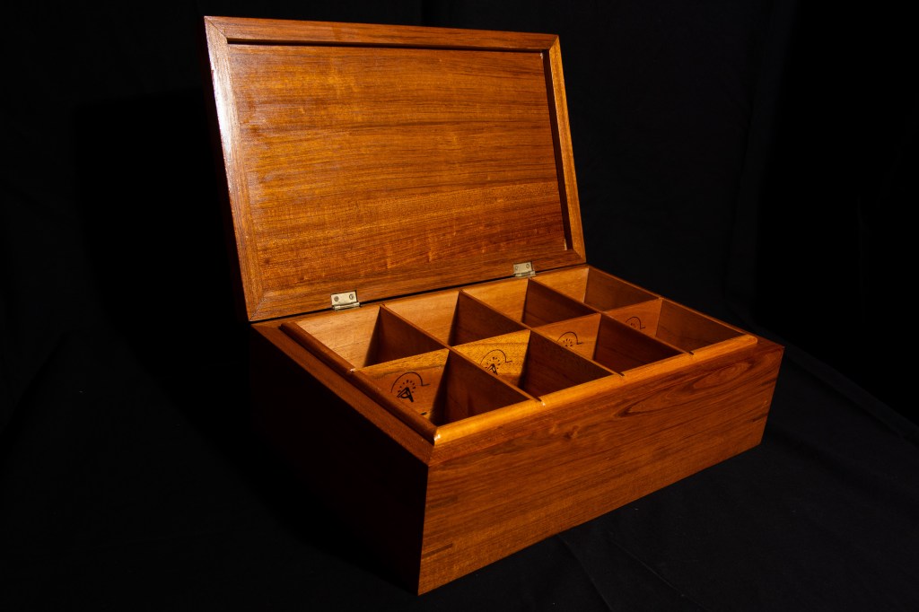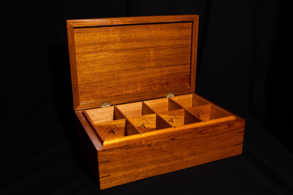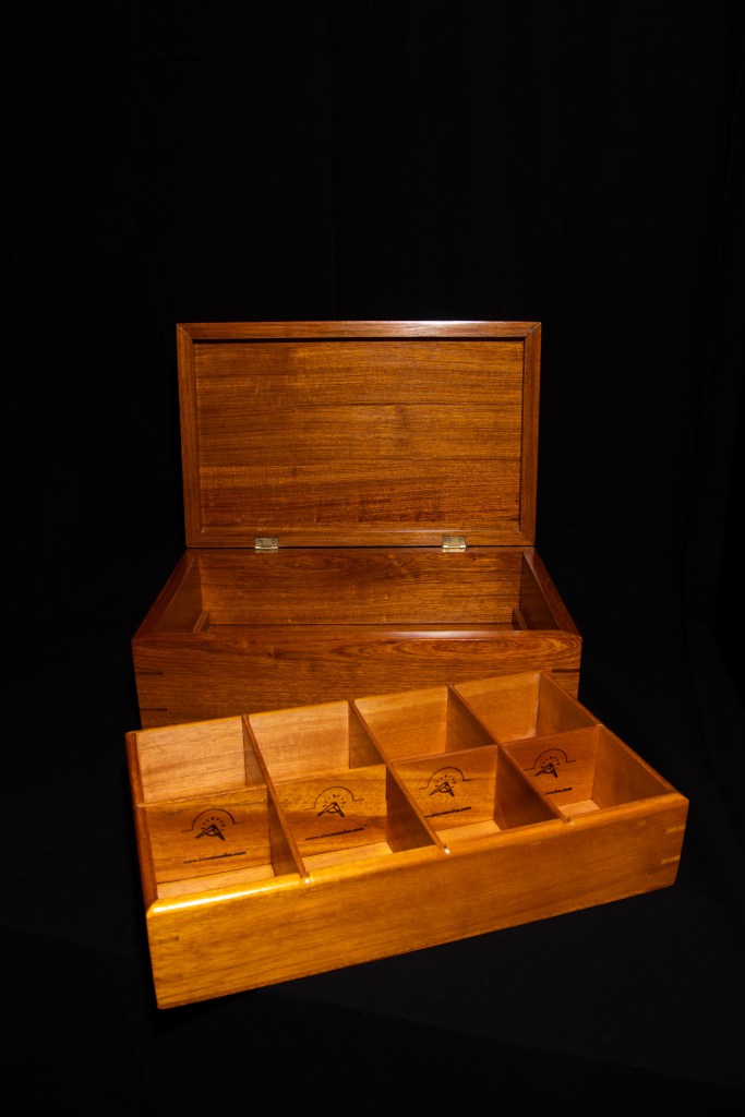 Diseñé esta caja de té para usar dos maderas como contraste, con ingletes reforzados y un compartimiento secreto en el doble fondo. La madera de esta versión, granadillo, es densa y resistente, con un color rojizo que combina muy bien con acabado dorado de la goma laca. Se suele usar para pisos. ¡Es una caja grande y pesada!